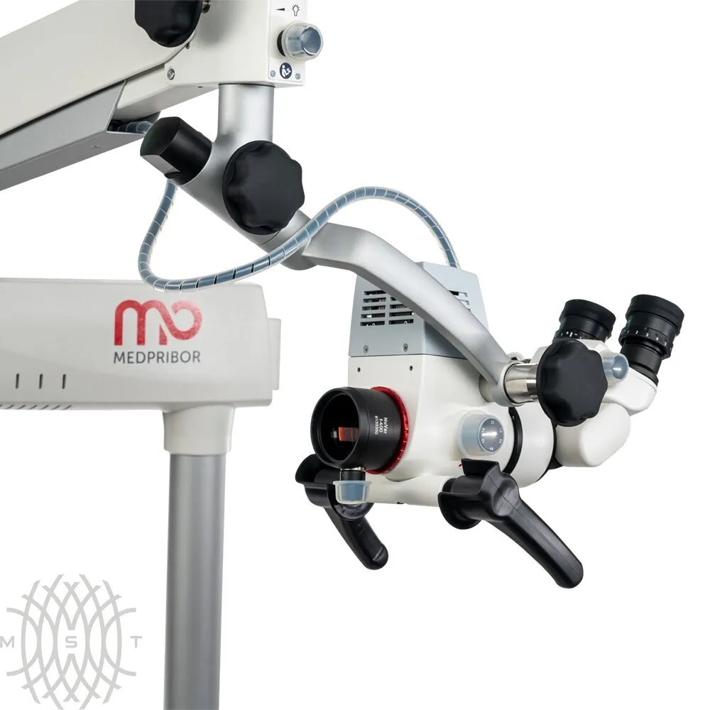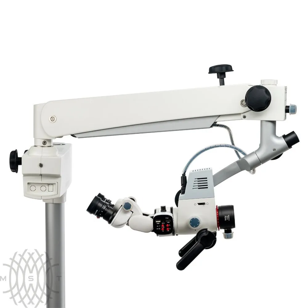 Апохроматическая оптическая система с пятиступенчатым увеличением. Ручки управления слева и справа на оптической голове. Защищены автоклавируемыми колпачками.