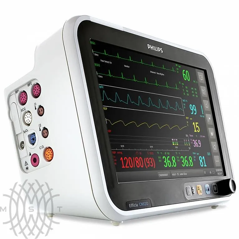 Philips Efficia CM120 монитор пациента предназначен для регистрации 3-5 ЭКГ отведений (возможно отображение 12 отведений - опция), при этом в монитор встроена запатентованная система Philips для анализа сегмента ST и его картирования в стандартной комплектации, а также программа анализа аритмий. Опционно может быть предложена продвинутая система анализа аритмии. Монитор способен регистрировать частоту дыхания путем измерения импеданса грудной клетки.