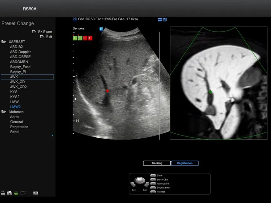 • S-Fusion - программа, позволяющая одновременную визуализацию участков печени, полученную при помощи ультразвукового исследования и данные КТ или МРТ автоматически на одном экране и в разных режимах (в том числе в режиме реального времени) с помощью специальных магнитных сенсоров на датчике